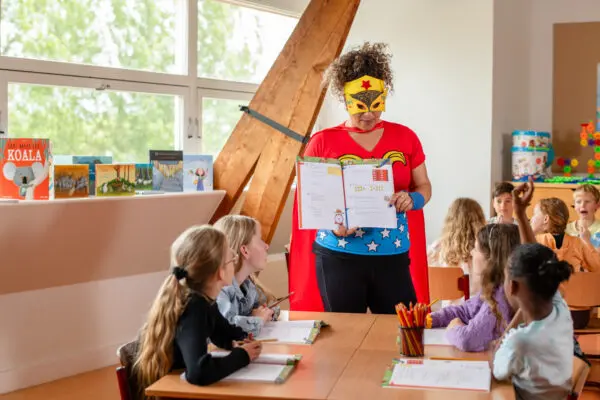 Je wordt niet zomaar superheld. Dat heeft Tessa van den Brink zelf ervaren. De eerste jaren als leraar in het basisonderwijs waren pittig, vertelt ze. “Ik stond voor groep 8 en was vooral didactisch bezig. Ik was druk met alles afkrijgen dat op de planning stond. En dat was veel! Pas na een paar jaar heb ik dat los kunnen laten. Dat gaf lucht; er ontstond ruimte voor een geintje en een spelletje. Het was een omslagpunt voor Tessa. “Ik voelde me een superheld toen ik de methode durfde los te laten en meer naar de kinderen zelf kon kijken.”