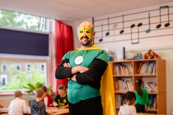 Op de Marnix Academie geeft Casper les aan superhelden in wording. Zijn missie? “Ik hoop persoonlijk dat iedere student naar zichzelf kan kijken en kan zeggen waar zijn sterke kanten liggen. Tegelijkertijd moet een student weten hoe hij die kwaliteiten voor het voetlicht van de kinderen kan brengen, zodat die zich daaraan op kunnen trekken.” Casper vervolgt: “Net zo belangrijk is het dat je je eigen kwetsbaarheden in de etalage durft te zetten. Sommige studenten durven bijvoorbeeld niet te zingen. Als je het dan tóch doet, zien kinderen dat het oké is om iets spannend te vinden. Je bent dan echt een held in hun ogen. Bovendien kom je tegemoet aan veel kinderen die zingen juist fantastisch vinden.”