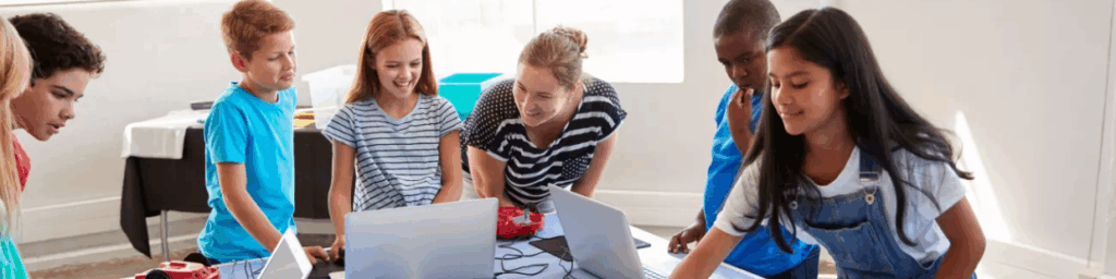 Leerlingen die samen met de lerares een ICT project uitvoeren.