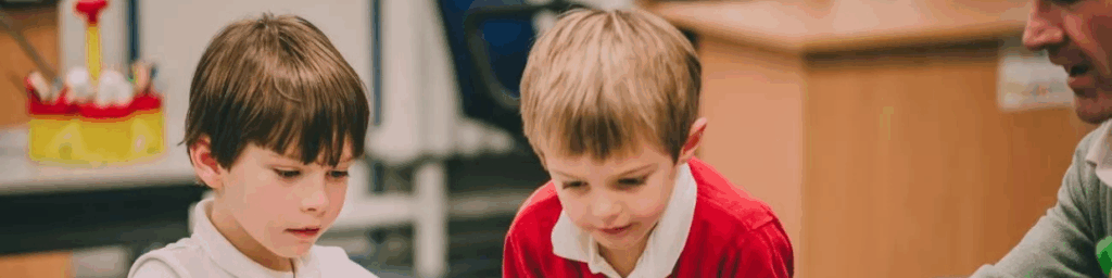 Twee leerlingen die samen met een leerkracht werken aan een opdracht.